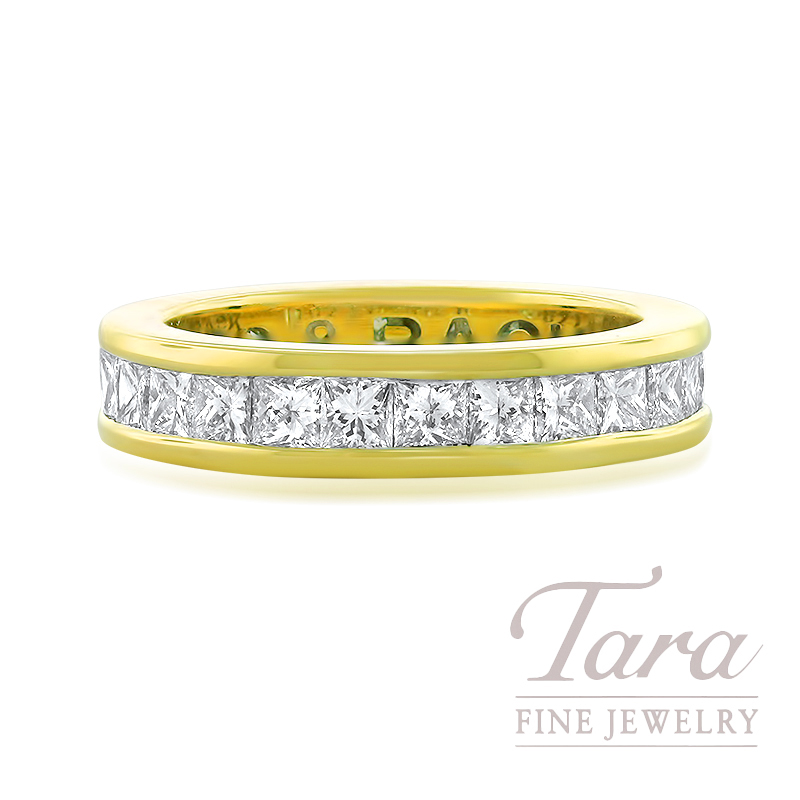 Few designs are as bold and enduring as this custom-made Princess Cut diamond eternity band. Crafted from brilliant 18K yellow gold, this exceptional band features 26 stunning princess-cut diamonds totaling an impressive 2.57 TDW. Designed with a full eternity silhouette, this band provides a continuous beam of light that serves as a spectacular backdrop to your personally selected engagement ring. As a custom-crafted piece from Atlanta’s expert jeweler, this ring is a true standout, offering a sophisticated and modern aesthetic for the discerning bride.