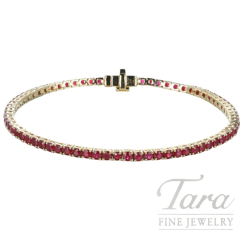 Sometimes you just need a touch of color to make an outfit extraordinary, and this gorgeous 18K Yellow Gold Ruby Bracelet is sure to do just that! Crafted from 18K Yellow Gold, in a tennis style design, this lovely Bracelet will add classic sparkle to any look. With 72 glowing Rubies at 4.36TGW, this Ruby Bracelet is a lovely enhancement for your fine jewelry collection!