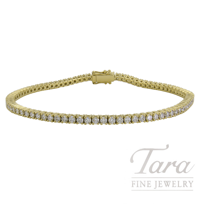 A Diamond Tennis Bracelet is the ultimate statement in timeless fashion! You can never go wrong with a Diamond Tennis Bracelet – it is one of the most versatile splendid gifts you could ever gift yourself or that special someone! Meticulously crafted from luminous 18K Yellow Gold, with 89 Round Diamonds at 2.00TDW, at 9.61G this lovely Diamond Tennis Bracelet exudes both class and a sense of chic style. Featuring exceptional Natural Diamonds, the Tennis Bracelets here at Tara Fine Jewelry Company promise unbelievable sparkle and comfort fit!