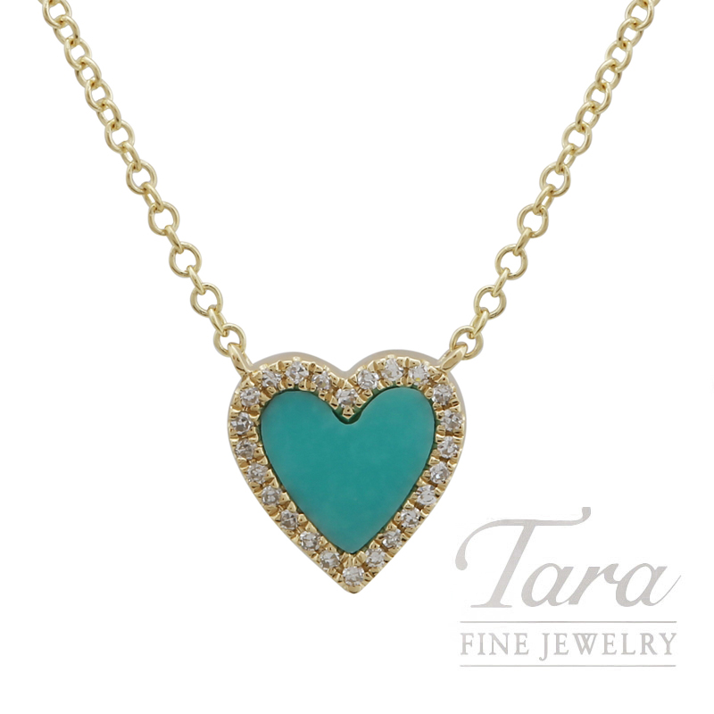 Embody the essence of romance with this exquisitely crafted 18K yellow gold turquoise and diamond heart necklace, a signature piece from Tara Fine Jewelry Company. Known as Atlanta's premier destination for exotic designer jewelry, we specialize in natural diamonds and rare gemstones responsibly sourced from across the globe. This delightful pendant features a mesmerizing 0.24-carat heart-shaped turquoise gemstone, brilliantly accented by 24 shimmering round diamonds totaling 0.06 carats. Meticulously forged in rich yellow gold and suspended on a versatile 16-to-18-inch adjustable chain, this necklace adds a sophisticated pop of color and timeless elegance to any wardrobe.