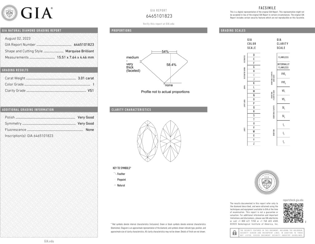 Experience the breathtaking allure of this magnificent 3.01CT Marquise Cut Diamond at Tara Fine Jewelry Company. Representing the pinnacle of regal elegance and sophisticated style, this GIA certified natural treasure features an elongated silhouette that creates a flattering slimming effect on the finger, while maximizing its impressive visual surface area. The Diamond is graded with an I color and VS1 clarity, which ensures a bright and eye catching appearance that remains clean to the naked eye. Every facet has been expertly polished to reflect light with extraordinary brilliance and fire making it a perfect centerpiece for a custom engagement ring or a spectacular pendant. This substantial 3.01CT Natural Diamond offers the rare combination of significant scale and refined quality that connoisseurs of fine jewelry truly appreciate.