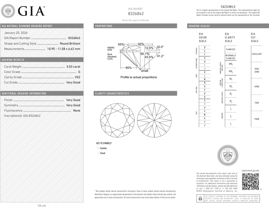 Embodying the pinnacle of luxury and light, this breathtaking 5.03CT GIA Certified Round Brilliant Natural Diamond stands as a testament to exquisite rarity and craftsmanship. Displaying a prestigious G color and VS2 clarity, this magnificent Diamond radiates unparalleled fire and brilliance from every facet.