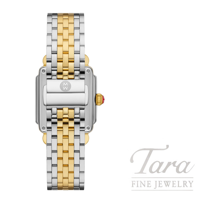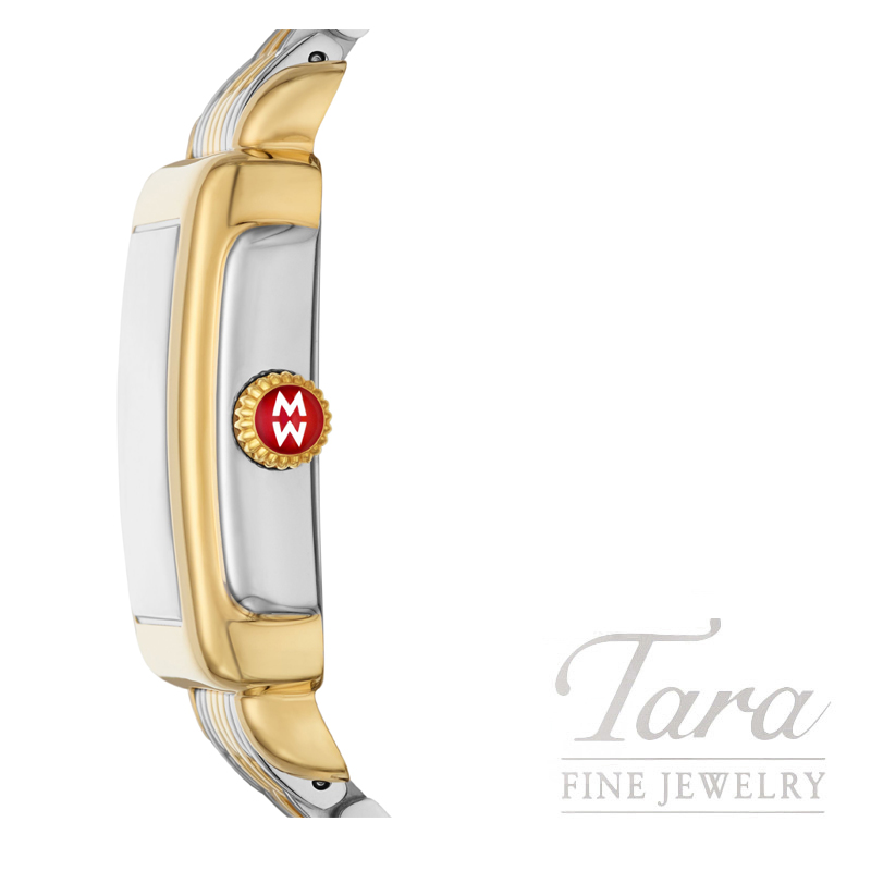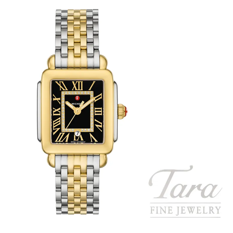 This Deco Madison Mid diamond dial watch features a noir high gloss pavé dial with 40 diamonds (0.10 carat weight) with Swiss three-hand date movement. Paired with a seven-link two-tone stainless steel bracelet with center links plated in 18k gold, the 16mm bracelet is made specifically for the Deco and Deco Madison collections and is interchangeable with any 16mm MICHELE strap.