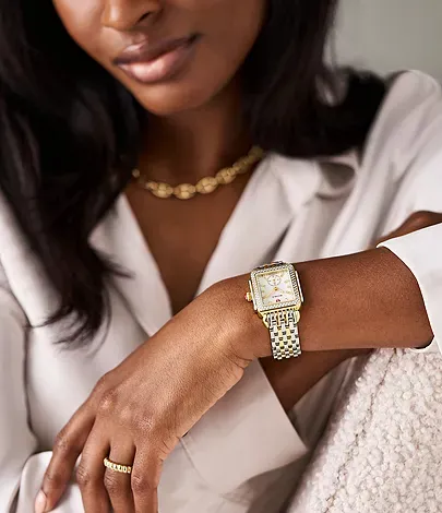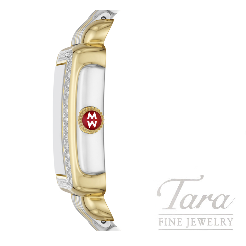 Inspired by the geometric shapes of Art Deco architecture, this two-tone Deco Mid shines with 126 hand-set diamonds (0.57 carat weight) on the bezel and atop the white mother-of-pearl dial adorned with double diamond hour markings. The signature MICHELE crown accents this stunning timepiece with a Swiss movement and the iconic seven-link two-tone stainless and 18K gold-plated bracelet is interchangeable with any 16mm MICHELE strap.