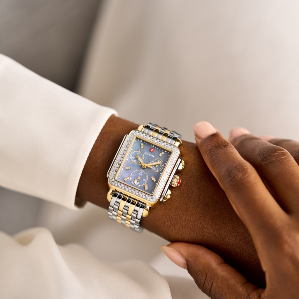 The rectangular case of the Deco two-tone 18K gold-plated Diamond Watch reflects the geometric shapes identified with Art Deco architecture. This iconic Swiss chronograph timepiece features 120 brilliant hand-set diamonds (0.65 carat weight) along the bezel and blue dusk mother-of-pearl dial with diamonds, three subeyes accented with gold foil and engraved MICHELE logos within the case walls. A two-tone 18K gold-plated seven-link bracelet adds the finishing touch and is interchangeable with any 18mm MICHELE strap.