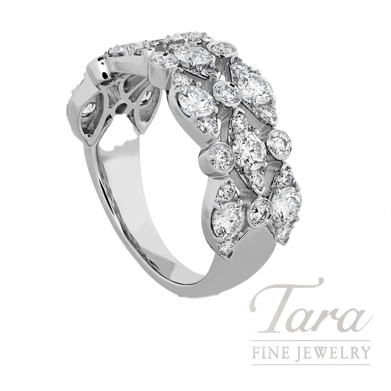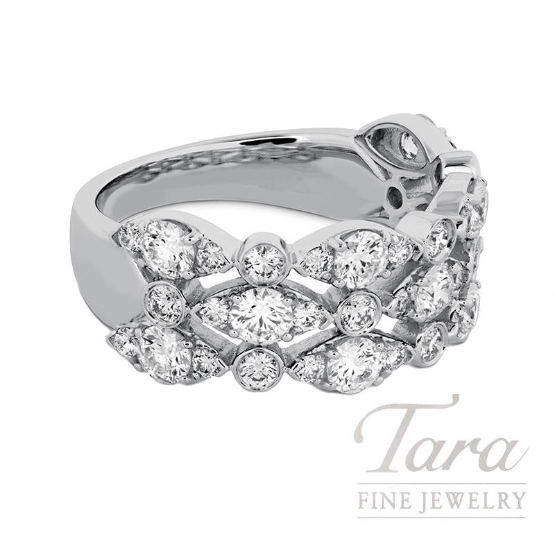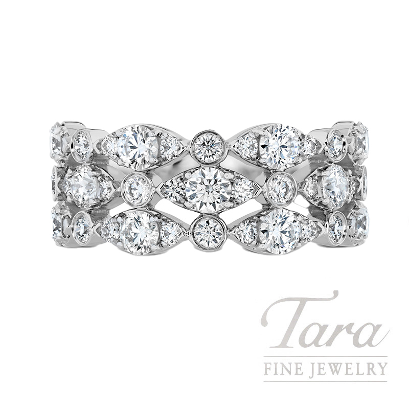 Add sophistication to your jewelry collection with the Hearts on Fire 18K White Gold Diamond Regal Triple Row Ring. Featuring 43 signature perfectly cut Round Diamonds in a variable triple row design at 1.63TDW, the 18K White Gold Band adds a touch of luxury to this stunning piece, while the expert craftsmanship ensures every detail is perfect. Versatile and timeless, this Hearts on Fire 18K White Gold Diamond Regal Triple Row Ring can be dressed up or down for any occasion.