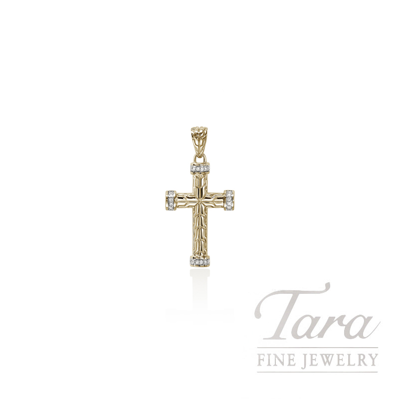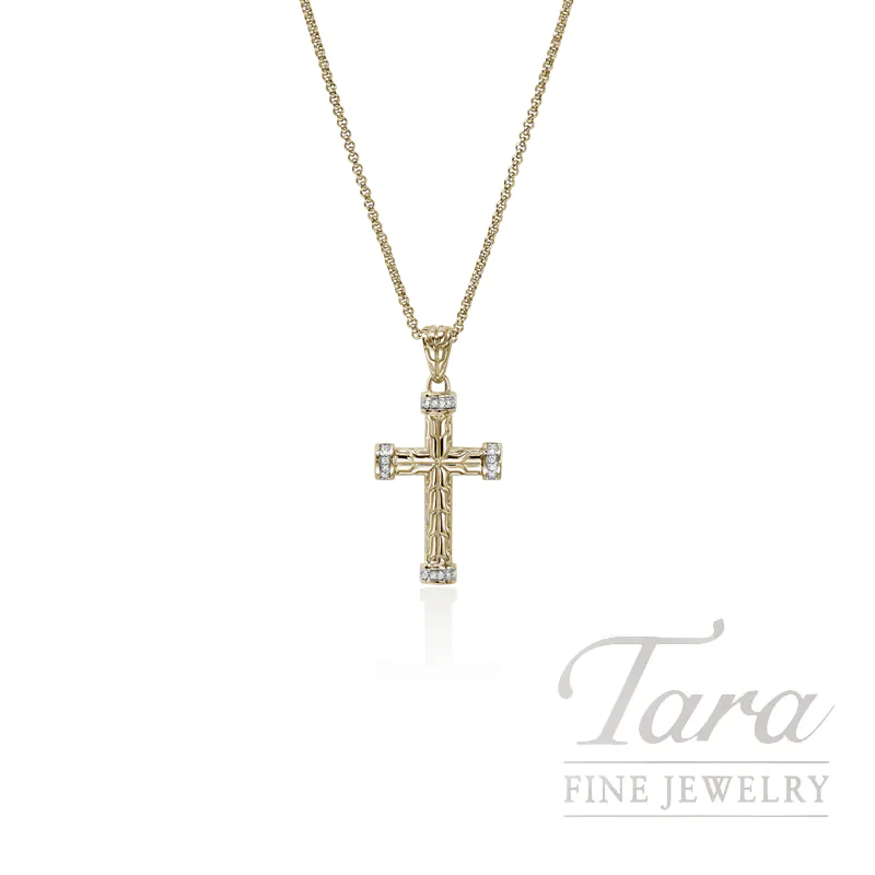 With a process as beautiful as its final product, Designer John Hardy is known for time honored techniques using ethically sourced reclaimed silver and gold. From the John Hardy Carved Chain Collection comes this enduring Cross Pendant, an accessory for all time. Created on the foundation of 14K Yellow Gold, the Pendant is a Cross design with Diamonds of 0.09CT TW. Artisan crafted, a beautiful accessory to complement the necklace of your choice (*sold separatel…