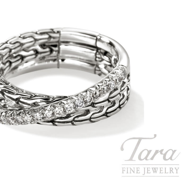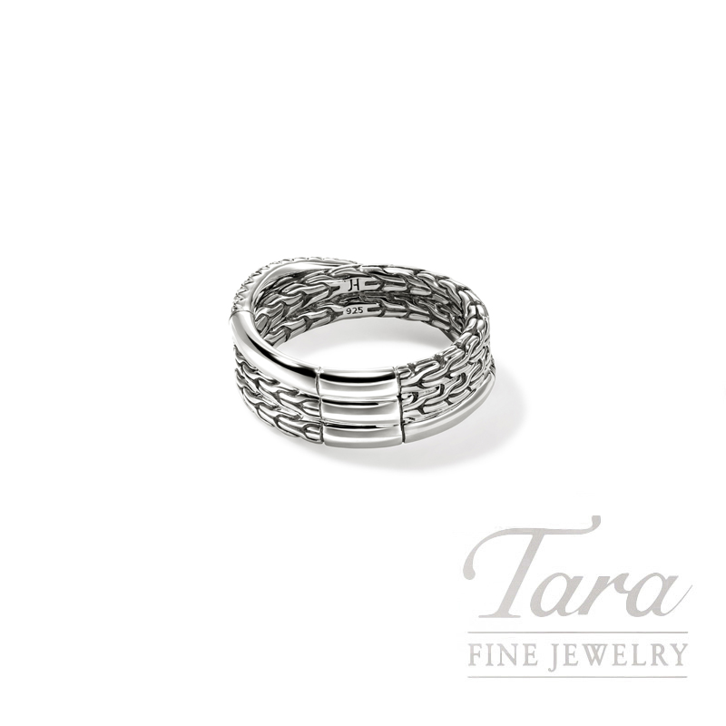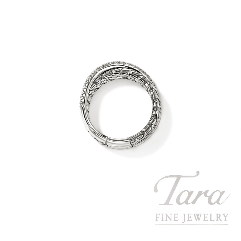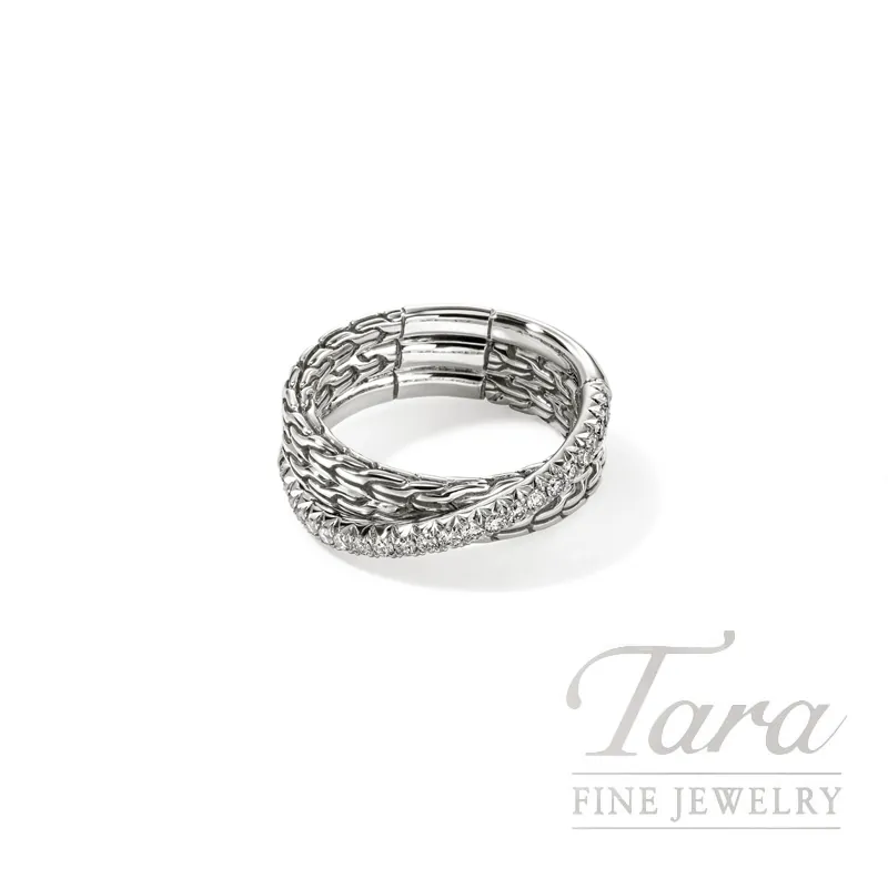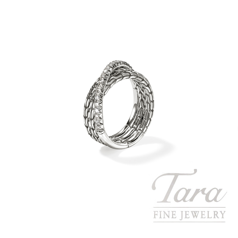 A crossover ring in reclaimed sterling silver and ethically sourced white diamonds, featuring our signature carved chain motif and a brilliant diamond pavé. Artisan handcrafted.