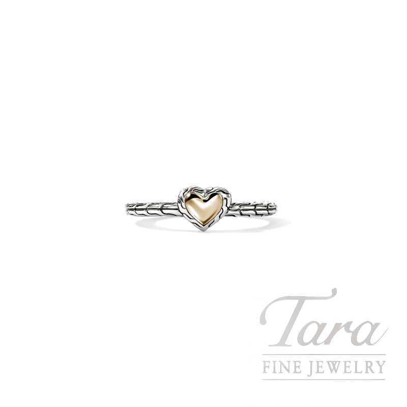 With a process as beautiful as its final product, Designer John Hardy is known for time honored techniques using ethically sourced reclaimed silver and gold. From the John Hardy Essentials Collection comes this enduring 14K Yellow Gold and Silver Ring, an accessory for all time. With a timeless Heart as the focal point, the Ring is handmade with care. Artisan crafted, an everlasting essential for your wardrobe!