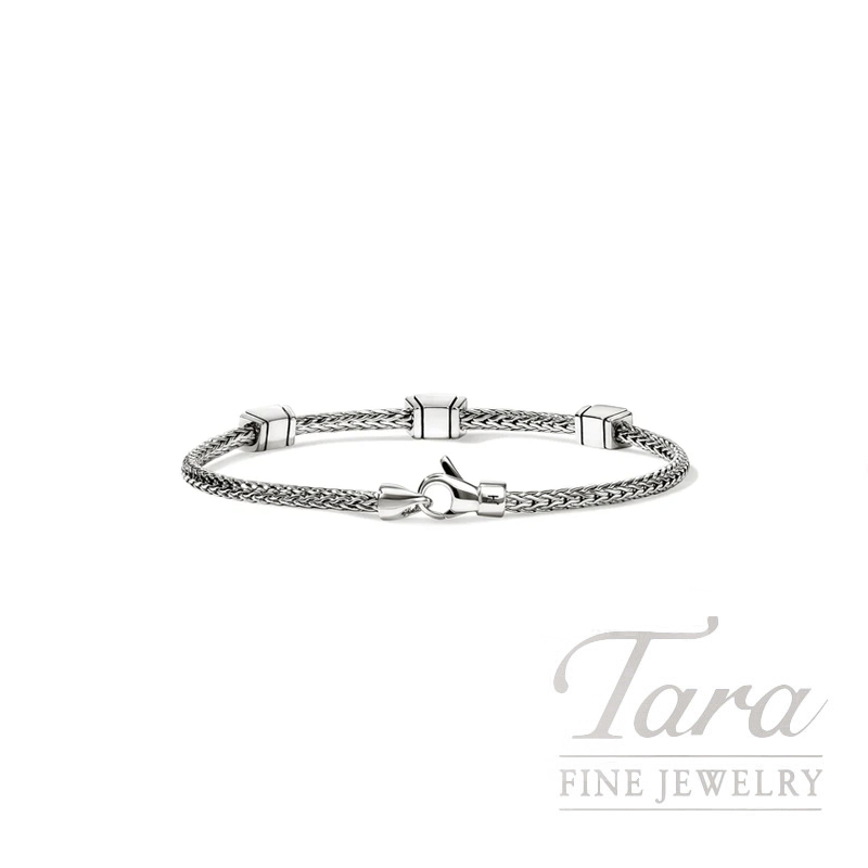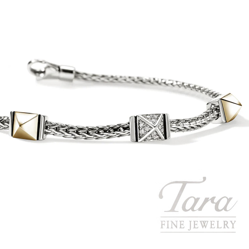 Artisanship with attitude. This sleek chain bracelet features three contrast studs accents. Crafted by hand in reclaimed sterling silver and gold with ethically sourced white diamonds.