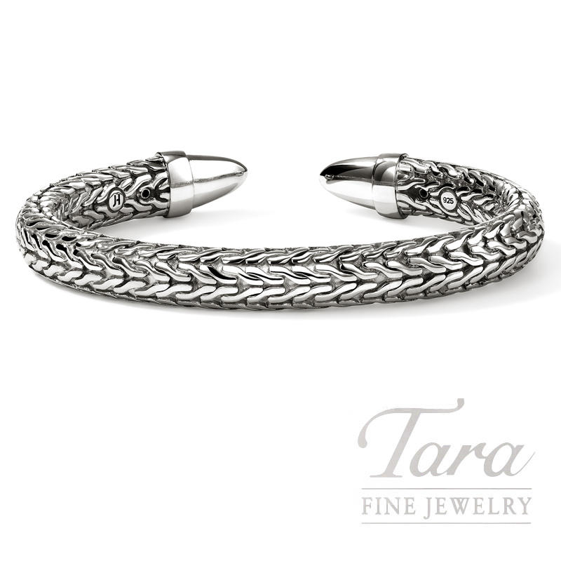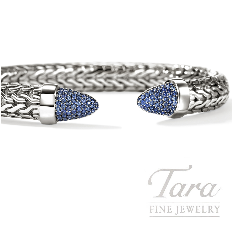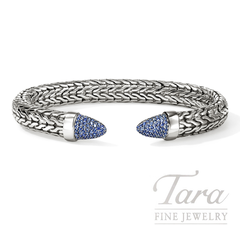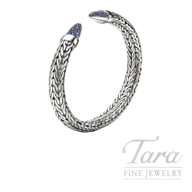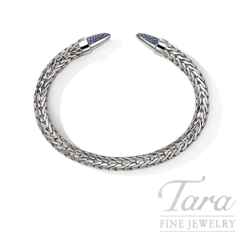 This archive-inspired flex cuff showcases our signature carved chain motif, finished with sleek, polished tips adorned in vivid blue sapphire accents. Expertly handcrafted in reclaimed sterling silver, it blends bold texture with refined brilliance for a modern, sculptural statement.