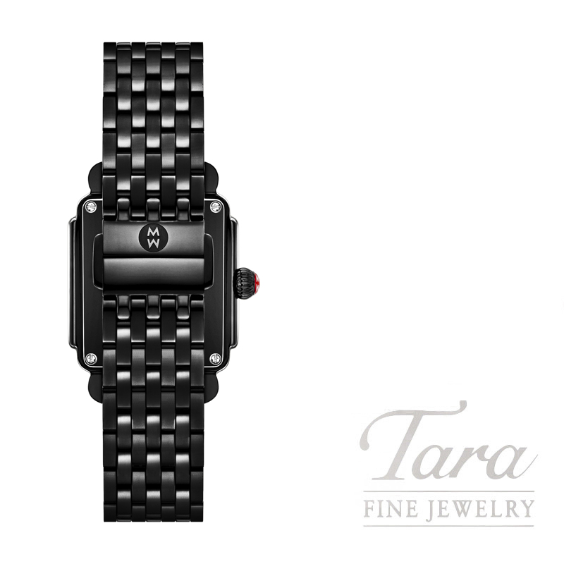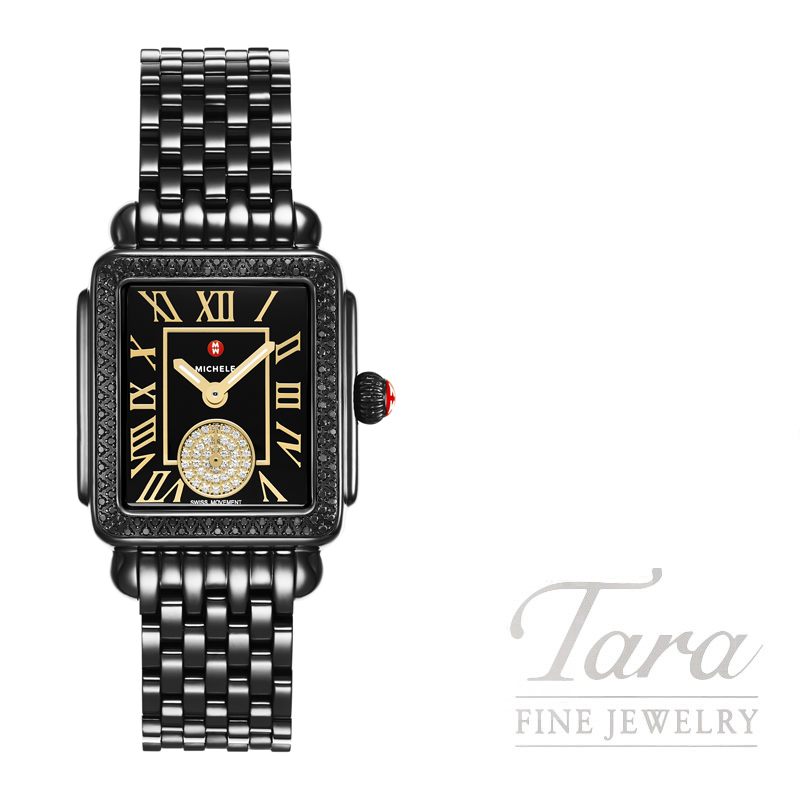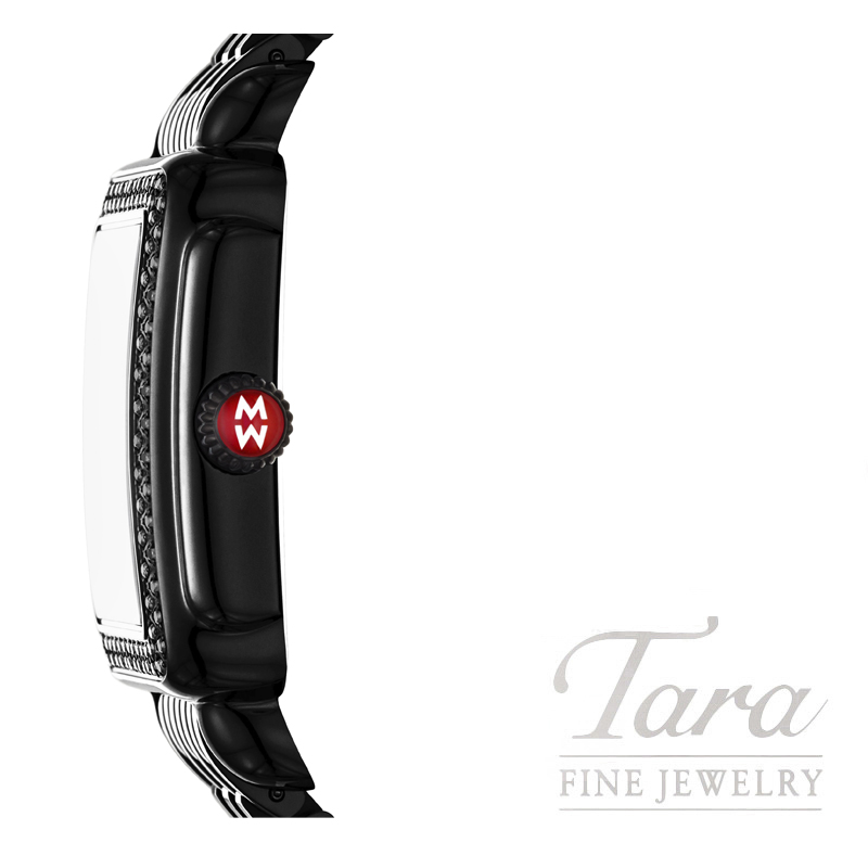 The Deco Madison Mid Diamond Noir Pavé Sub-Eye watch features 146 hand-set diamonds, totaling 0.57 carats. The glossy black dial with gold accents compliments the black IP plated case and stainless steel bracelet featuring a butterfly deployant closure for a seamless finish, while a sapphire crystal ensures lasting durability. Powered by a precise Swiss quartz movement, this timepiece blends modern sophistication with meticulous craftsmanship.