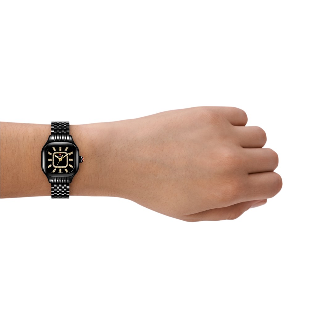 Elegant curves add modern elegance to the case of MICHELE’s stunning Meggie Noir Diamond Dial watch that sparkles with 60 hand-set diamonds (0.19 carat weight) and a noir gloss dial with diamond inner ring and signature double diamond indexes set in gold. This watch features a Swiss movement and a gleaming 14mm black IP stainless steel seven-link bracelet made specifically for the Meggie collection interchangeable with any 14mm MICHELE strap.