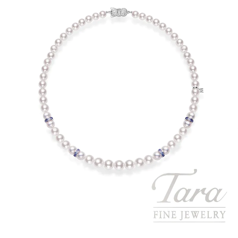 The Mikimoto designer brand has a reputation for crafting the most exquisite pearl jewelry in the world, and this breathtaking 18K White Gold Akoya Pearl Strand illustrates their unmatchable craftsmanship and quality pearls. Tara Fine Jewelry Company proudly offers the best selection of Mikimoto Pearls in Atlanta because we love that each and every Mikimoto Pearl exudes luxurious design and nature’s raw, natural beauty. This stunning designer necklace features brilliant 18K White Gold and impeccable Akoya Pearls. To bring a pop of color, this lavish pearl necklace is adorned with 40 beautiful Blue Sapphires at 2.00TGW throughout the strand. You will fall in love with this wonderful Mikimoto creation!