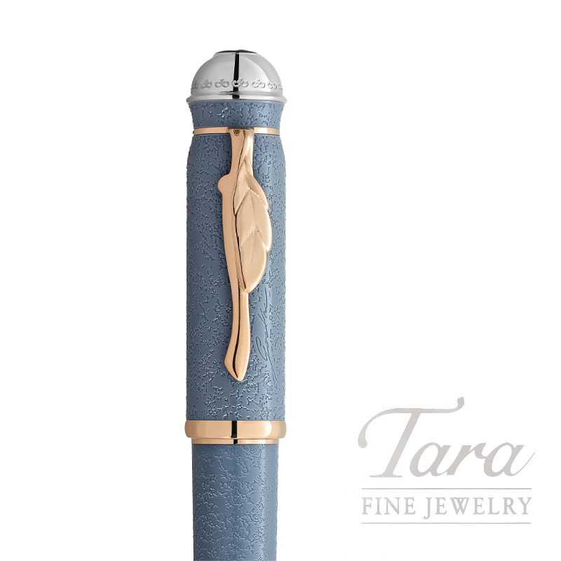 Montblanc celebrates one of man’s greatest achievements, written word, in this Montblanc Writer’s Edition Goethe Rollerballl Pen. As a tribute to Wolfgang Von Goethe, this captivating Limited Edition Rollerball Pen recognizes Goethe’s impact as a scholar, playwright, philosopher, naturalist, and statesman. Each writing instrument of this collection features meaningful design details that reference different periods in his life. Featured in an alluring shade of blue, the MB Writer’s Edition Rollerball Pen is designed with a precious resin barrel and cap, along with a gold-coated leaf shaped signature clip. At a weight of over 46 grams, this substantial Montblanc Rollerball Writers Edition Goethe Pen has a significance presence.