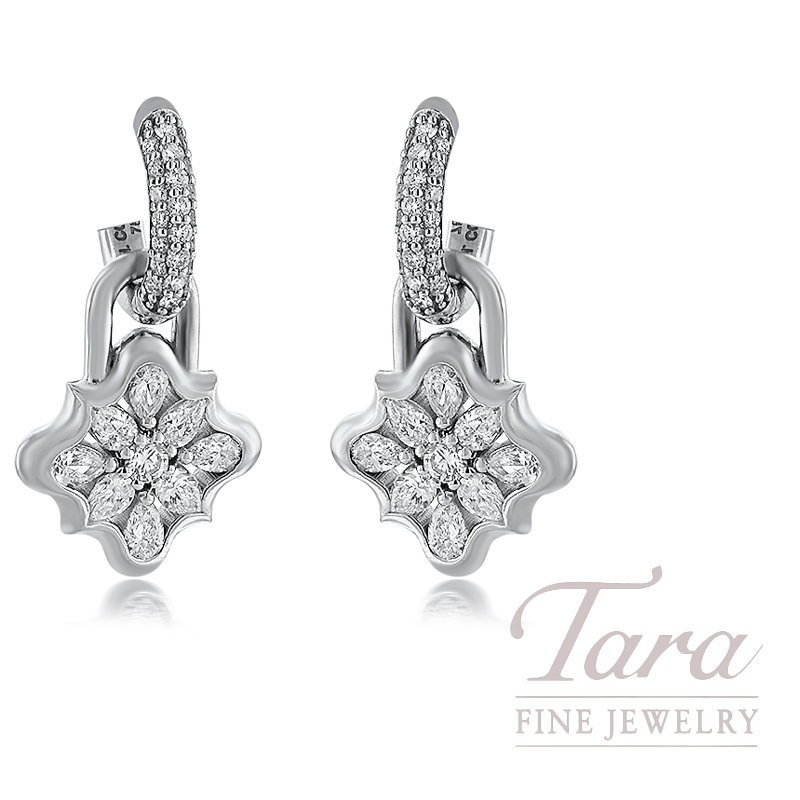 She is sure to adore the attention to detail in these lovely Diamond Earrings! Showcase the allure of these delightful 18K White Gold Diamond Earrings! With its creative design, this pair of Earrings will dance around in the light as the Natural Diamonds radiate from your ears. Crafted in 18K White Gold, with 62 glistening Round Diamonds 2.00TDW, these lovely Diamond Earrings invoke a sense of romantic elegance!