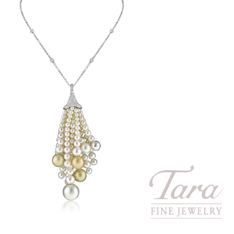 Designer Norman Covan graces us with this lovely 18K White Gold Diamond Pearl Tassel Pendant. Crafted with a joyous blend of luminous Pearls, at 37.2G the bale features 76 Round Diamonds at 0.80TDW. This alluring Pearl Diamond Pendant is paired with an 18K White Gold Diamond Station Necklace (*sold separately), to complete the look. With an aura of vintage beauty, what a magical combination!