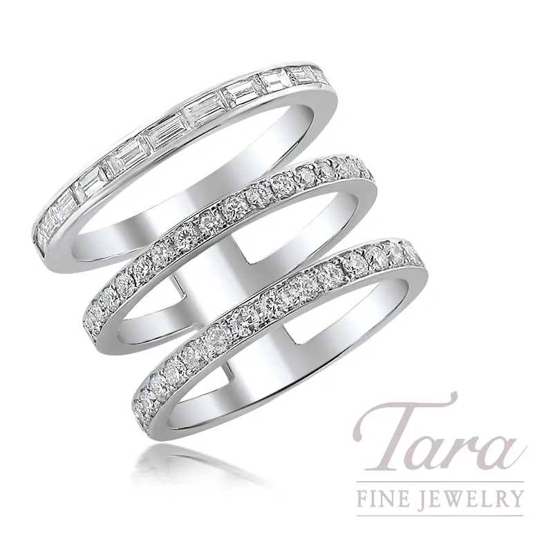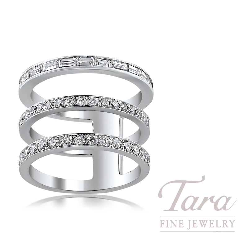 Delight in the unique beauty of this Norman Covan 18K White Gold Diamond Ring! Created with a ladder pattern design, the three rows feature a creative blend of 49 Round and Baguette Diamonds at 1.45TDW. Built on the foundation of 18K White Gold, at 7.7G, this stylish Diamond Ring is a whimsical Ring to bring fun to any look!
