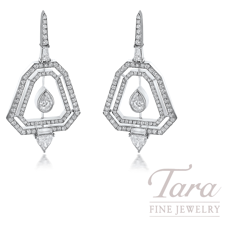 Showcase the allure of these regal 18K White Gold Diamond Earrings! This vintage styled pair of Diamond Earrings will dance around in the light as the Diamonds dangle from your ears. Crafted in 18K White Gold, with 96 glistening Diamonds of various shapes, at 2.84TDW, these lovely Diamond Earrings invoke a sense of historical elegance!
