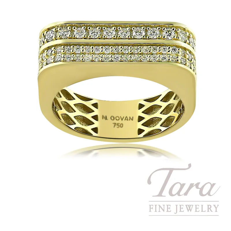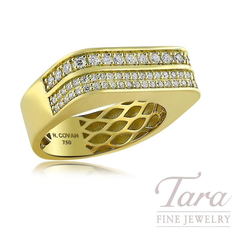 Drawing inspiration from diverse cultures and historical empires, famed designer Norman Covan has created a memorable piece in this 18K Yellow Gold Diamond Double Tiered Diamond Ring. Crafted on the precious metal foundation of 18K Yellow Gold, at 6.9G, this stately Diamond Ring leaves a remarkable impression! With 64 Round Natural Diamonds across the band .60TDW, this lovely Diamond Ring yields infinite sparkle!