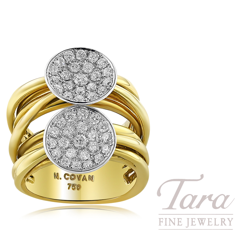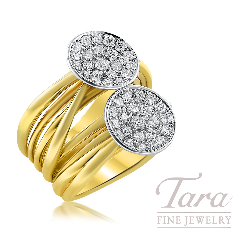 With endless strands of luminous 18K Yellow Gold, this gorgeous Norman Covan Diamond Ring exhibits infinite beauty! Designed with 45 Round Diamonds at 1.05TDW, the accent of 18K White Gold spotlights the Diamonds as an engaging contrast against the 18K Yellow Gold. Truly a unique masterpiece, this modern design is captivating!