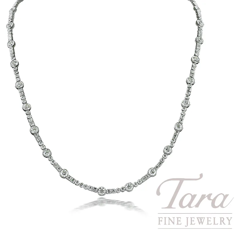 From our esteemed Tara Luxe Collection, we proudly present this dazzling Platinum and 18K White Gold Diamond Necklace! What a beauty in such creative design techniques, as reflected with the varying shapes of the Natural Diamonds throughout this station Necklace. At a generous diamond weight of 13.09TDW and 25.7G, this notable Diamond Necklace exudes prestige and class. A true statement piece to pass from one generation to another!