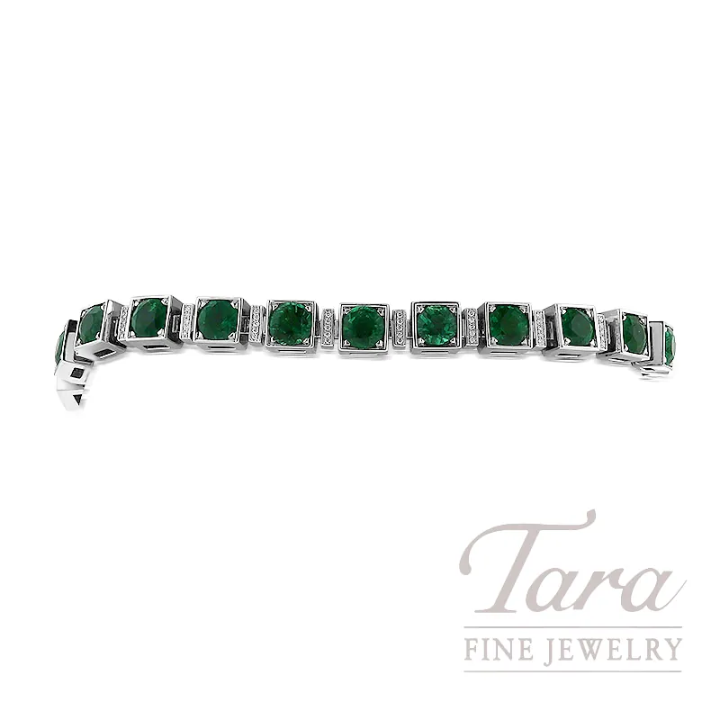 From our esteemed Tara Luxe Collection, we are proud to present this magnificent Platinum Emerald Diamond Bracelet! A sight to behold, this extraordinary Bracelet is a stellar symbol of class and luxury. With 20 Zambian Emeralds at 11.92TW, the generous allotment of gemstones establishes the royal aura of this majestic Bracelet. At 41.0G and a length of 7″, the exquisite placement of 95 Round Diamonds exudes the characteristics of a lovely period piece.