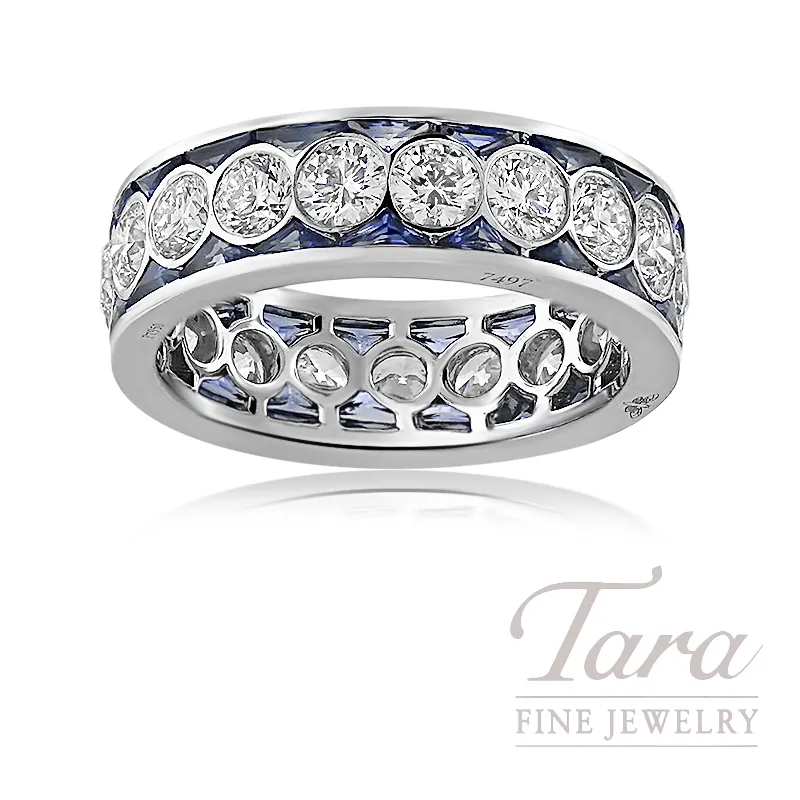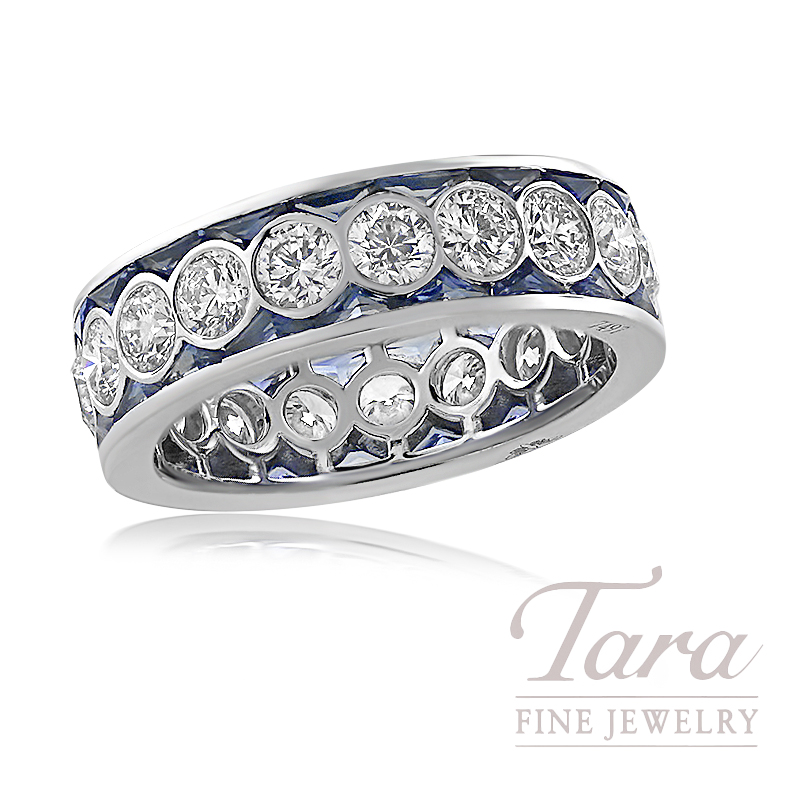 Discover the combination of elegance and luxury with this lovely Platinum Blue Sapphire Diamond Band! Crafted on the timeless foundation of Platinum, this breathtaking Ring showcases 40 Blue Sapphires 4.66TW and 19 Round Natural Diamonds at 2.35TDW. You will fall in love with this beautiful Blue Sapphire Diamond Ring from Tara Fine Jewelry Company!