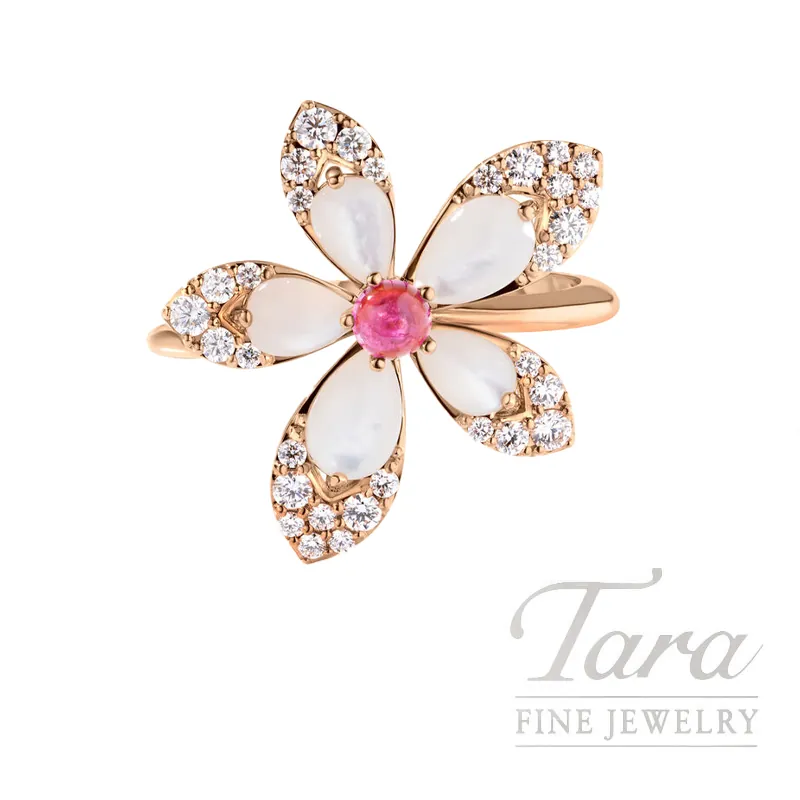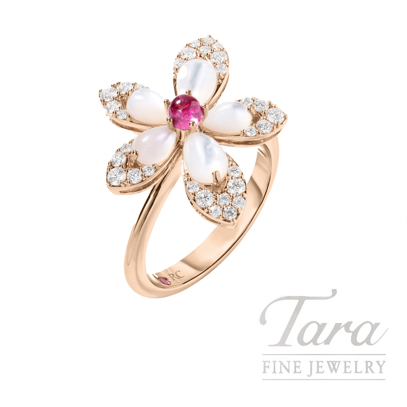 Designed to invoke a sense of romance, this gorgeous Roberto Coin 18K Rose Gold Tiare Mother-of-Pearl Diamond Flower Ring will bring romantic beauty to your jewelry wardrobe! This whimsical Roberto Coin Ring is crafted from glowing 18K Rose Gold with a five petal design of Mother of Pearls at 1.40CT TW. The floral petals are framed by 31 shimmering Natural Diamonds at .22TDW. The accent of the .15CT Rubellite provides the perfect enhancement for this lovely Ring.