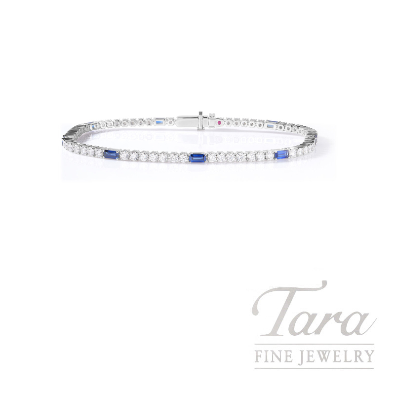 Sometimes you just need a touch of color and sparkle to make an outfit extraordinary, and this gorgeous 18K White Gold Blue Sapphire Diamond Bracelet will do just that! Classy yet dazzling, this 9.9G Sapphire Diamond Bracelet is crafted in brilliant 18K White Gold. The Bracelet features 106 Round Diamonds at 2.40TDW and 8 Baguette Sapphires at 1.06TW. You will fall in love with the mesmerizing beauty of this gorgeous Diamond Sapphire Bracelet!