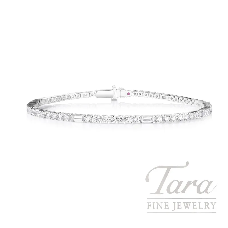 Radiant and glamorous, this stunning Roberto Coin 18K White Gold Diamond Bracelet promises endless sparkle for a very special lady! Experience true luxury with the help of expert Atlanta Jewelers, Tara Fine Jewelry Company – your Atlanta TAG Heuer Dealer and best choice for Engagement Rings in Atlanta. We are proud to showcase this sensational Diamond Bracelet! Crafted in luminous 18K White Gold and featuring 60 sparkling Round Diamonds and 8 Baguette Diamonds for a grand total of 9.30TDW. This remarkable Diamond Bracelet is luxury at its finest!