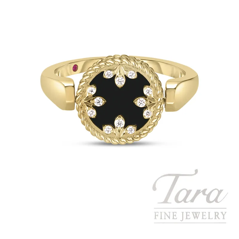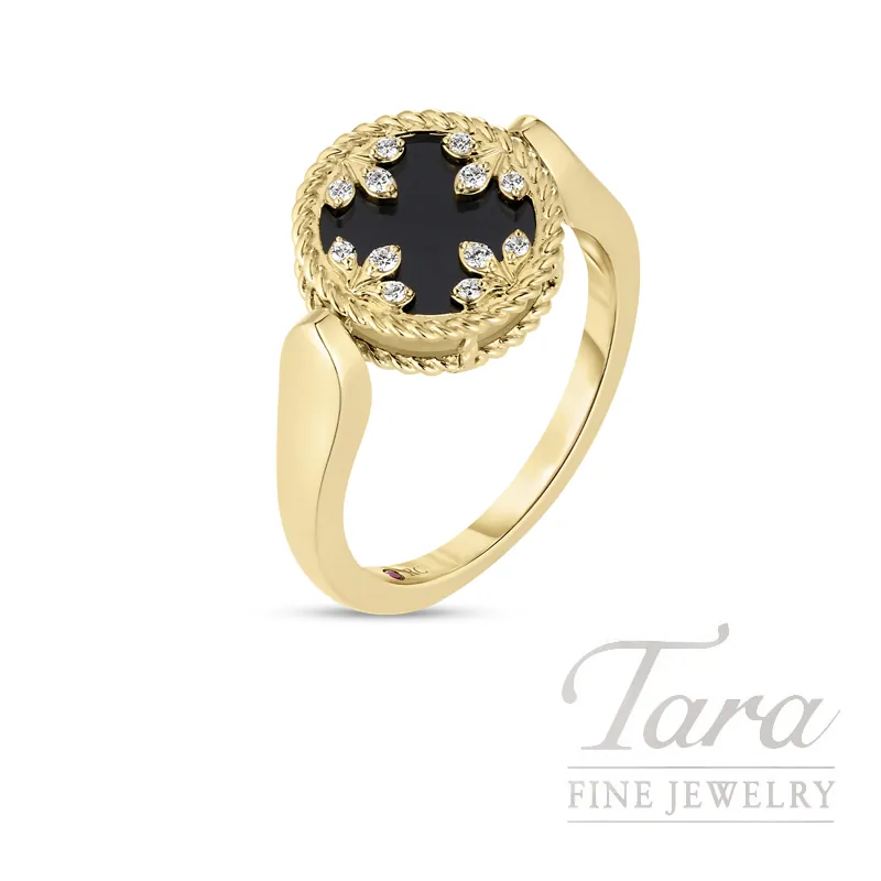 Nothing can top the stand-alone beauty of this gorgeous Roberto Coin 18K Yellow Gold Black Jade and Diamond Venetian Medallion Ring! With a radiant Gemstone and sparkling Natural Diamonds, this lovely Ring is a wonderful addition to your fine jewelry collection! Brilliant 18K Yellow Gold is the foundation of the captivating Ring. The front design features Black Jade 2.00TW and 12 twinkling Round Diamonds .05TW, the obverse bears a delicate floral design. Why settle for the ordinary when you can have Extraordinary!