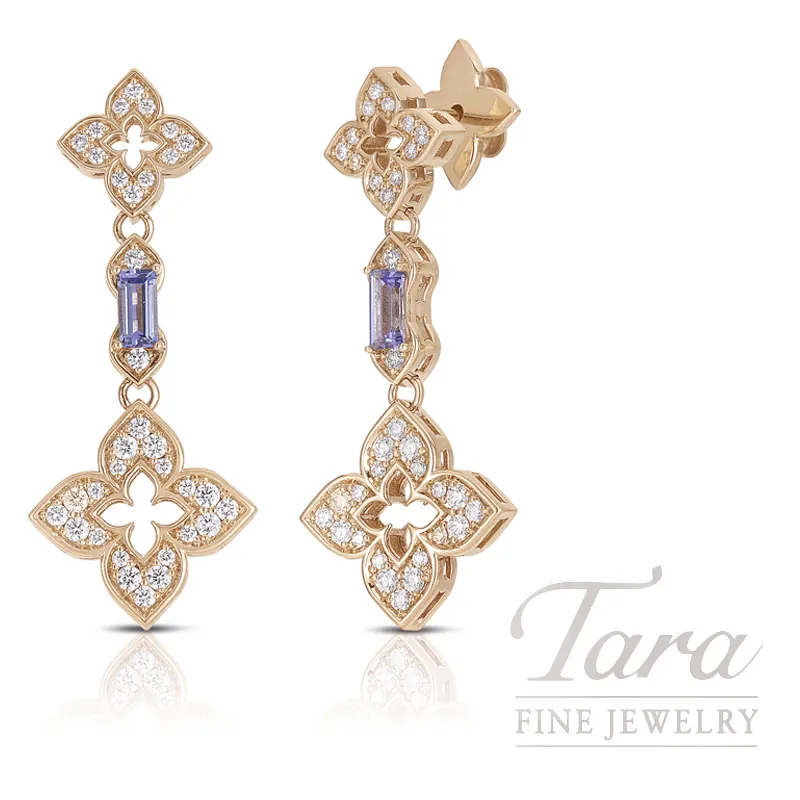 Famed designer Roberto Coin has paired elegance with style in these 18K Rose Gold Diamond Tanzanite Earrings. Featuring a dangling drop style design, the 18K Rose Gold is accented by the periwinkle shade of the 2 Baguette Cut Tanzanites 0.45TGW. Light is captured by the 68 Round Natural Diamonds 0.59TDW making these Roberto Coin Tanzanite Diamond Earrings glimmer from afar!
