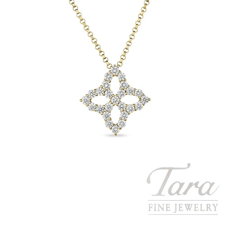 Show-off a charming and feminine sense of style with this fabulous Roberto Coin 18K Yellow Gold Diamond Venetian Princess Flower Necklace! As a Roberto Coin Retailer and your expert jeweler for Diamond Engagement Rings in Atlanta, Tara Fine Jewelry Company is the best choice for luxurious jewelry of the finest quality. This beautiful Diamond Pendant displays an enchanting floral-like design and the petals on this beautiful flower-like pendant are adorned with 25 twinkling Round Diamonds at 0.50TDW. Charming and captivating, your jewelry collection will never be the same once you have added the elegant beauty of this wonderful Roberto Coin Princess Flower Diamond Pendant!