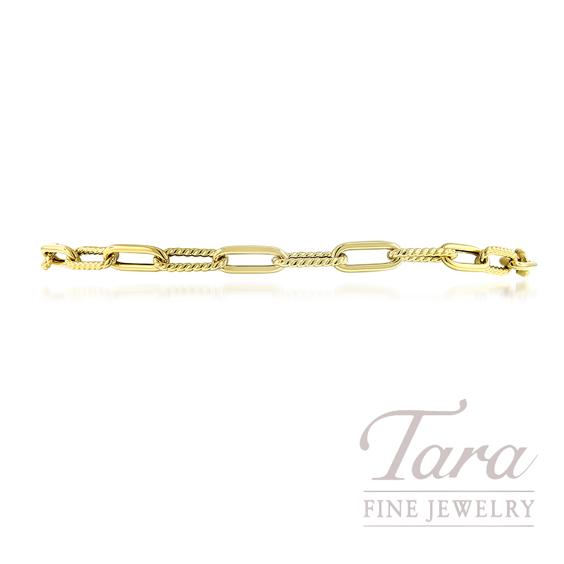 Modern and fresh, this Roberto Coin 18K Yellow Gold Paper Clip Link Bracelet is a contemporary yet timeless designer accessory to add to your jewelry collection. Crafted in rich 18K Yellow Gold, this 7″ Bracelet features a blended design of smooth and fluted texture Paper Clip Links. You will adore the enduring glow of this Roberto Coin 18K Yellow Gold Fluted Paper Clip Bracelet as it adorns your wrist.