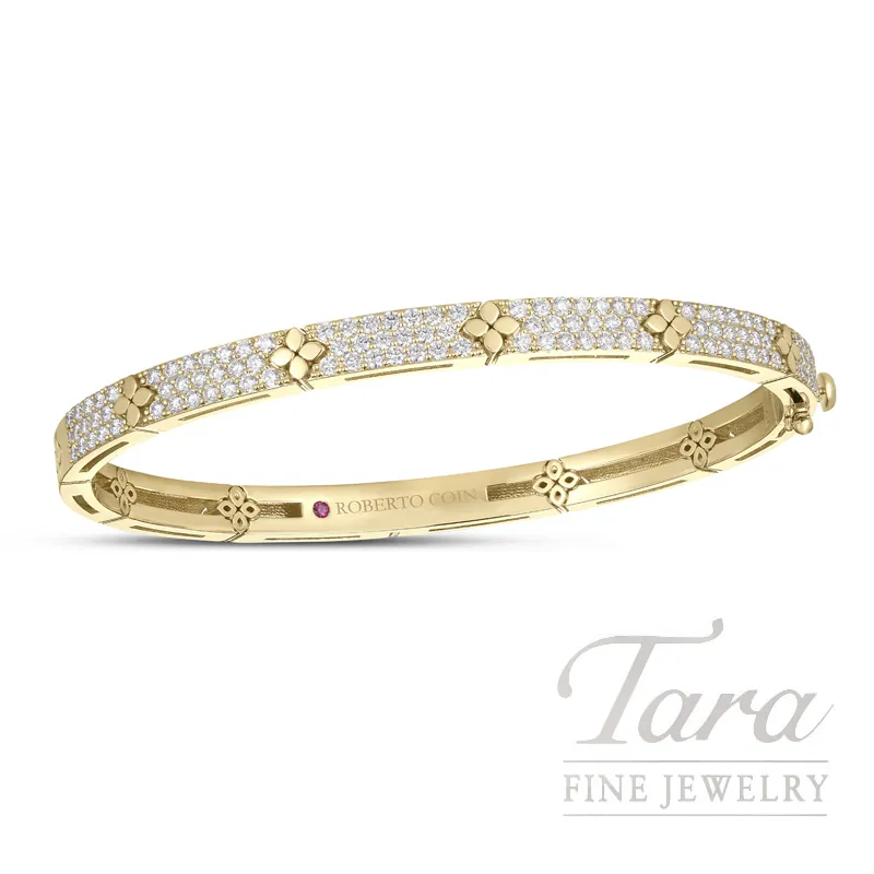 Designer Roberto Coin has truly outdone himself with this scintillating 18K Yellow Gold “Love in Verona” Diamond Bangle! As your Atlanta retailer of Roberto Coin Jewelry, Tara Fine Jewelry Company is globally known for one-of-a-kind jewelry! This dazzling Roberto Coin Diamond “Love in Verona” Bangle is crafted in 18K Yellow Gold and features 108 round dazzling Diamonds at 1.45TDW for the perfect amount of sparkle. As a symbol of eternal love, the four-petal design of the "Love in Verona" collection is a reminder of your inner beauty. This outstanding Roberto Coin “Love in Verona” Diamond Bangle is sure to take your jewelry collection to the next level!