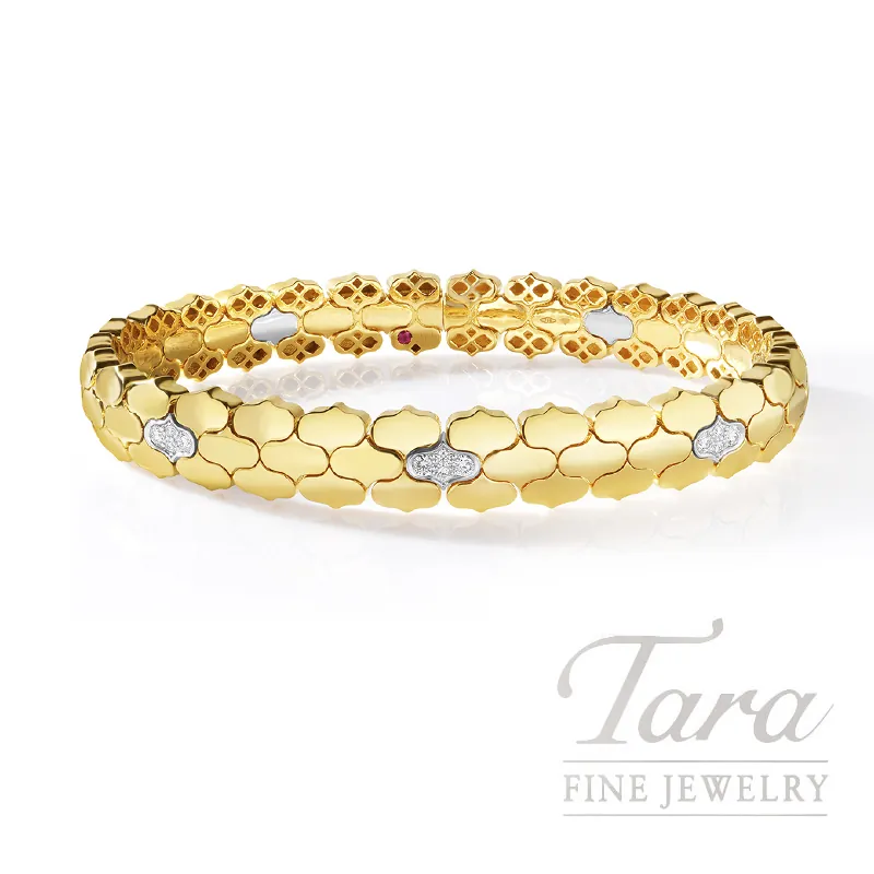 Striking, fashionable, and absolutely radiant is exactly how everyone will describe this magnificent Roberto Coin Diamond Cobra Bangle when you wear it! At Tara Fine Jewelry Company, we are known as the Atlanta jeweler with a keen eye for quality and fashion. This wonderful Roberto Coin Diamond Cobra Bangle is crafted of rich 18K Yellow and White Gold that is designed with a polished finish. As if bright yellow gold wasn't a bold enough fashion statement, this bangle dazzles with 0.30TDW of Round Diamonds set in 18K White Gold. This lavish Roberto Coin bangle includes such remarkable detailing that it is sure to be that go-to accessory every woman needs in her jewelry collection.