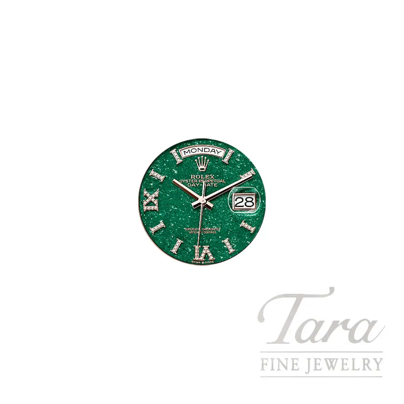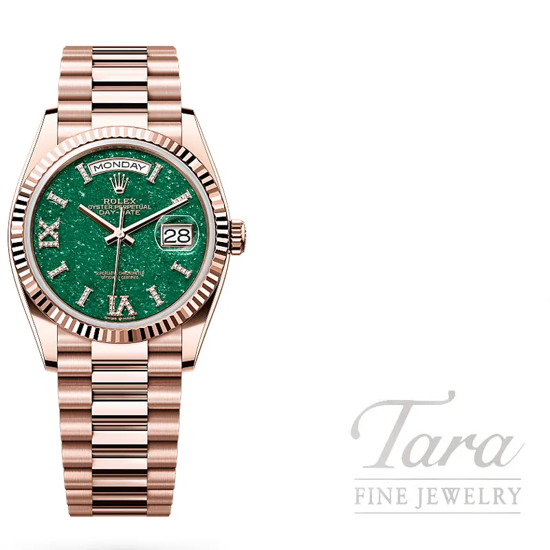 At Tara Fine Jewelry Company, you will find the pinnacle of luxury with this never worn Rolex Day-Date 36MM. Combining the warmth of proprietary 18K Everose Gold with the rare brilliance of a natural Green Aventurine Diamond dial, the unique stone dial is crafted from a shimmering crystalline texture with factory-set diamond hour markers that ensure no two watches are exactly alike. The iconic fluted bezel and signature President Bracelet highlight the prestigious aesthetic of the Everose Gold Day-Date, while the Rolex Calibre 3255 movement provides industry-leading precision and a 70-hour power reserve. Whether you are searching for a high-value investment or a standout statement piece, this Everose Gold Rolex with Aventurine dial offers an unparalleled blend of horological complexity and timeless style
