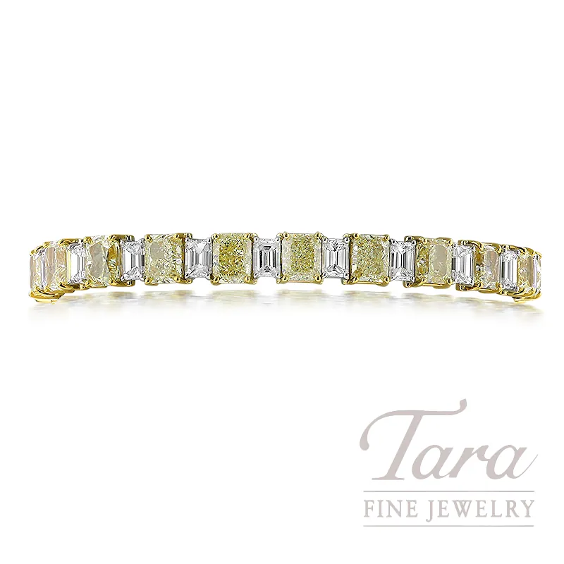 From our Tara Luxe Collection, Tara Fine Jewelry Company is proud to feature this gloriously magnificent Platinum 18K Yellow Gold Diamond Bracelet. At a generous weight of 36.4G, this marvelous Diamond Bracelet is crafted in a tennis style design with 20 Emerald Cut Fancy Yellow Diamonds and 20 Radiant Cut White Diamonds at 31.93TDW. All eyes on you, as this spectacular Platinum 18K Yellow Gold Diamond Bracelet is captivating!