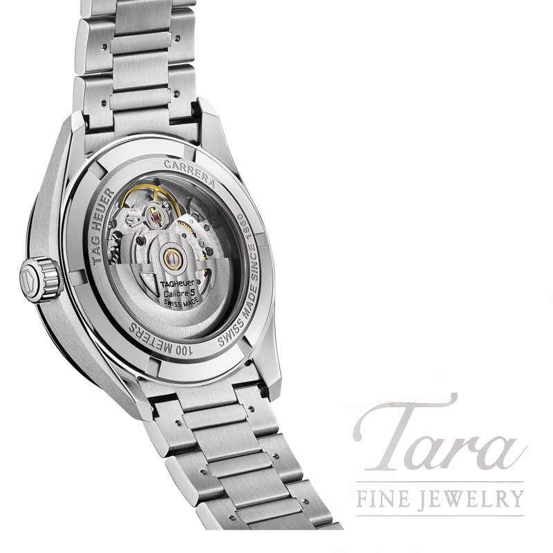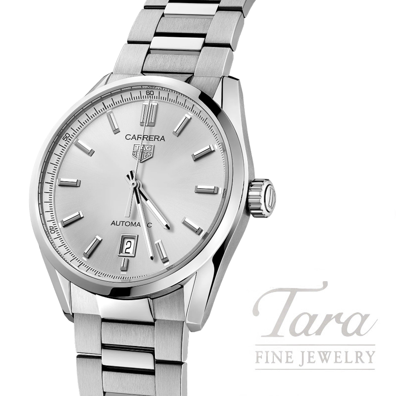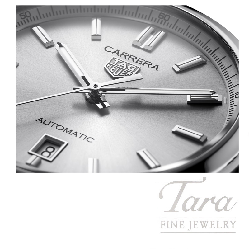 This TAG Heuer Carrera is ready for anything. Its brushed silver sunray dial is a statement of luxury, beautifully highlighted by the functional and elegant rhodium-plated TAG Heuer logo and Super-Luminova® hands and indexes.