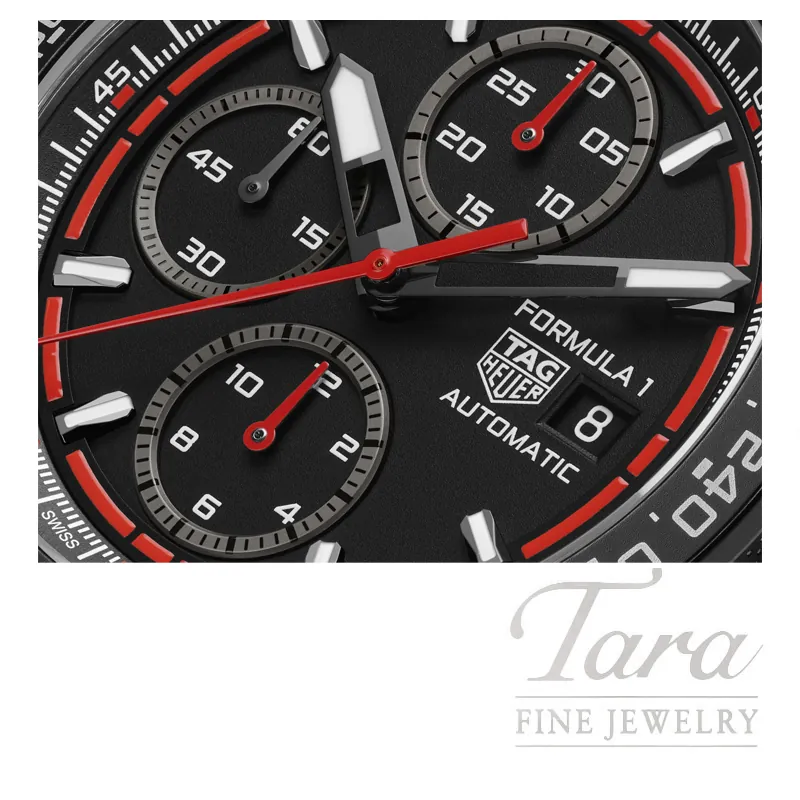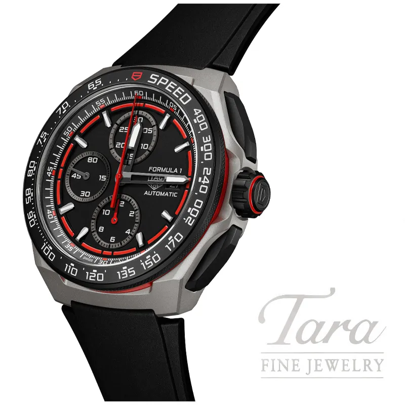 Designed for the daring, the TAG Heuer Formula 1 Chronograph in 44mm brings the spirit of racing to the wrist. The titanium grade 2 case, red accents, and rugged rubber strap create a timepiece ready for any challenge.