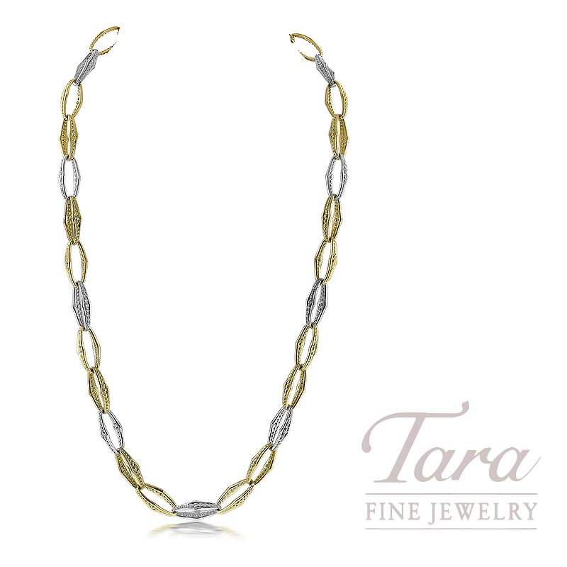 Radiant and glamorous, this sensational Verragio 18K White and Yellow Gold Diamond Necklace promises endless sparkle for a very special lady! Measuring 17.5″ in length with a chic fancy link pattern, this lovely Diamond Necklace is designed with 360 Natural Round Diamonds at 2.08CT TW, interwoven with gold links. This Diamond Necklace is indeed a ray of sunshine for casual or formal dress.