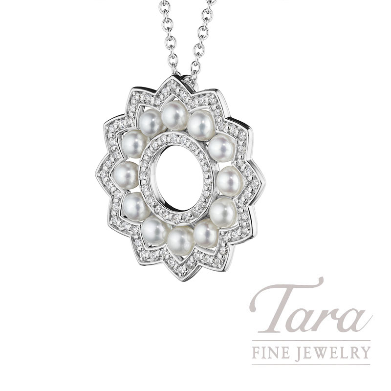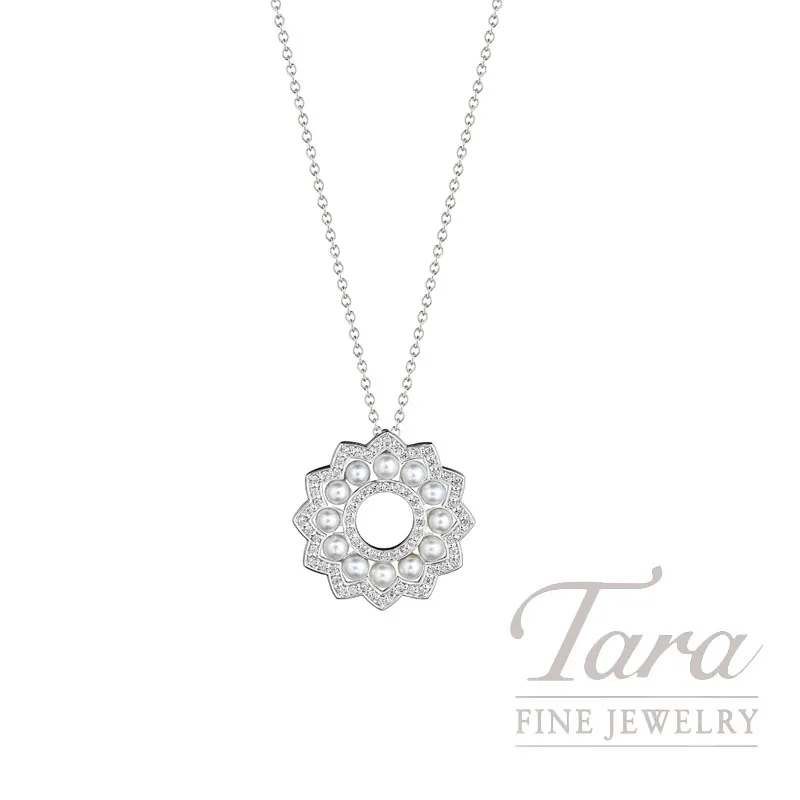 Create your signature style in Verragio’s Reverie Pearl and Diamond Pendant Necklace. In 18K White Gold, it is a showstopper with timeless style. This lovely Pearl and Diamond Pendant is crafted into a floral like circle and adorned with a luminous array of Round Pearls. The creatively designed outline of Round Brilliant Cut Diamonds 0.25TW, adds to the mystical allure of this lovely Pendant Necklace. Enchanting and elegant, your jewelry collection will never be the same once you add this Verragio 18K White Gold Reverie Diamond and Pearl Pendant Necklace!