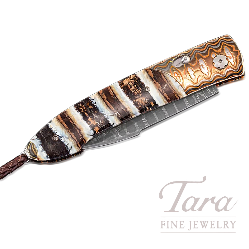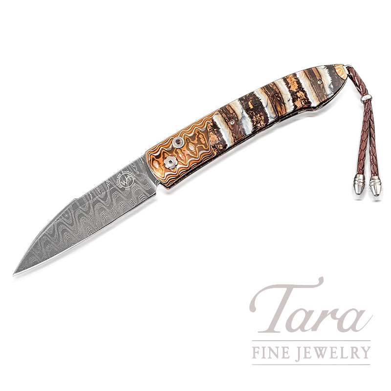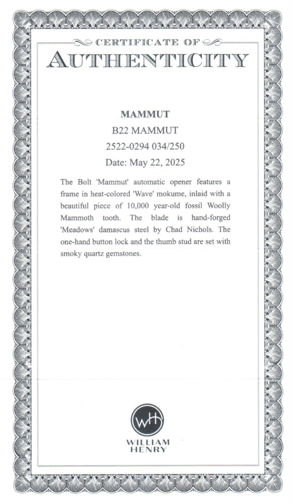 The distinguished William Henry B22 Mammut Pocket Knife features a frame in heat-colored Wave mokume, a metalworking technique fusing various metals together. The handle of the Knife is inlaid with a beautiful piece of 10,000 year old fossil Woolly Mammoth tooth. The blade is hand forged Meadows’ Damascus Steel by Chad Nichols. With a one hand button lock set with a smoky quartz gemstone, this remarkable Knife yields a comfort fit.