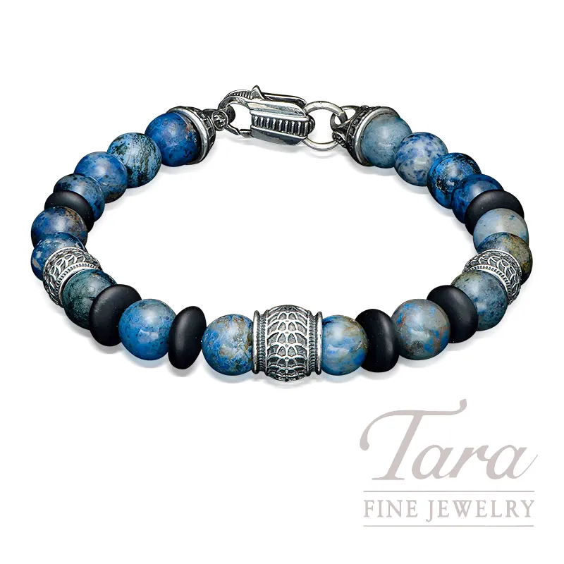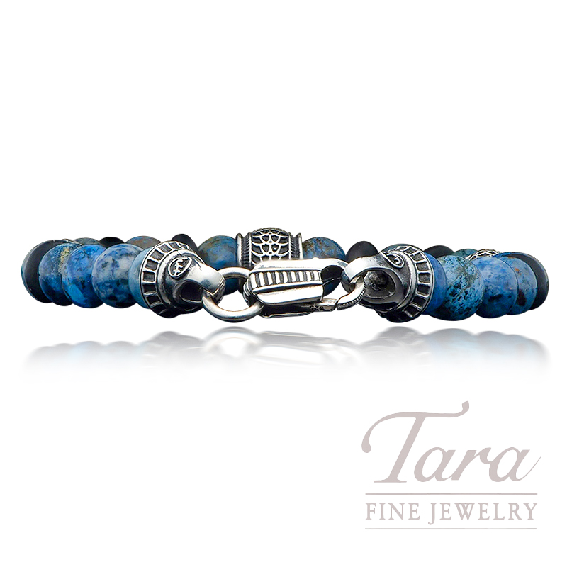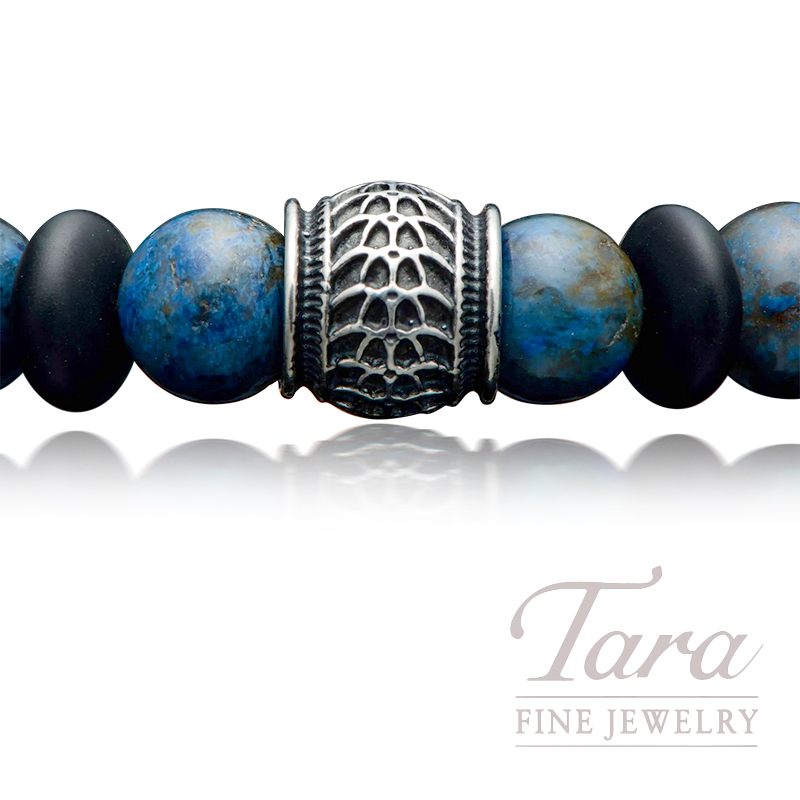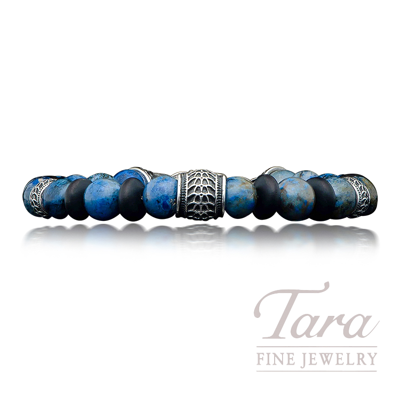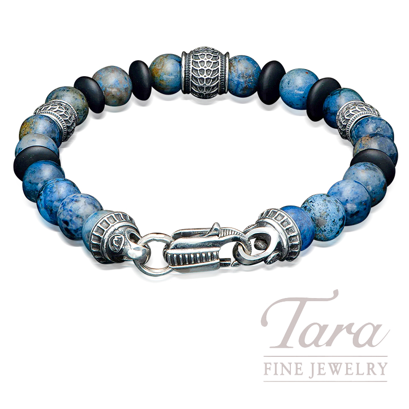This dynamic William Henry Newport Dumortierite Bracelet is like its namesake of Newport, Oregon – bold, beautiful, rugged, and timeless. The Bracelet features three custom Sterling Silver beads, as well as Sterling end caps and is equipped with a lobster clasp. The Silver beads, sculpted with geometric web, are flanked by earth marble blue Dumortierite with matte Black Onyx spacer beads, all built on welded stainless aircraft cable for durability. Elegant on its own, plays well with others, a beautiful highlight to any outfit!